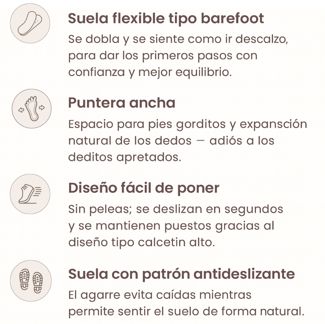 Son perfectis para bebés desde los 6 meses (antes de caminar) hasta los 4 años. La suela flexible y la sensación de contacto con el suelo ayudan a los bebés que aprenden a caminar a desarrollar mejor equilibrio y confianza.